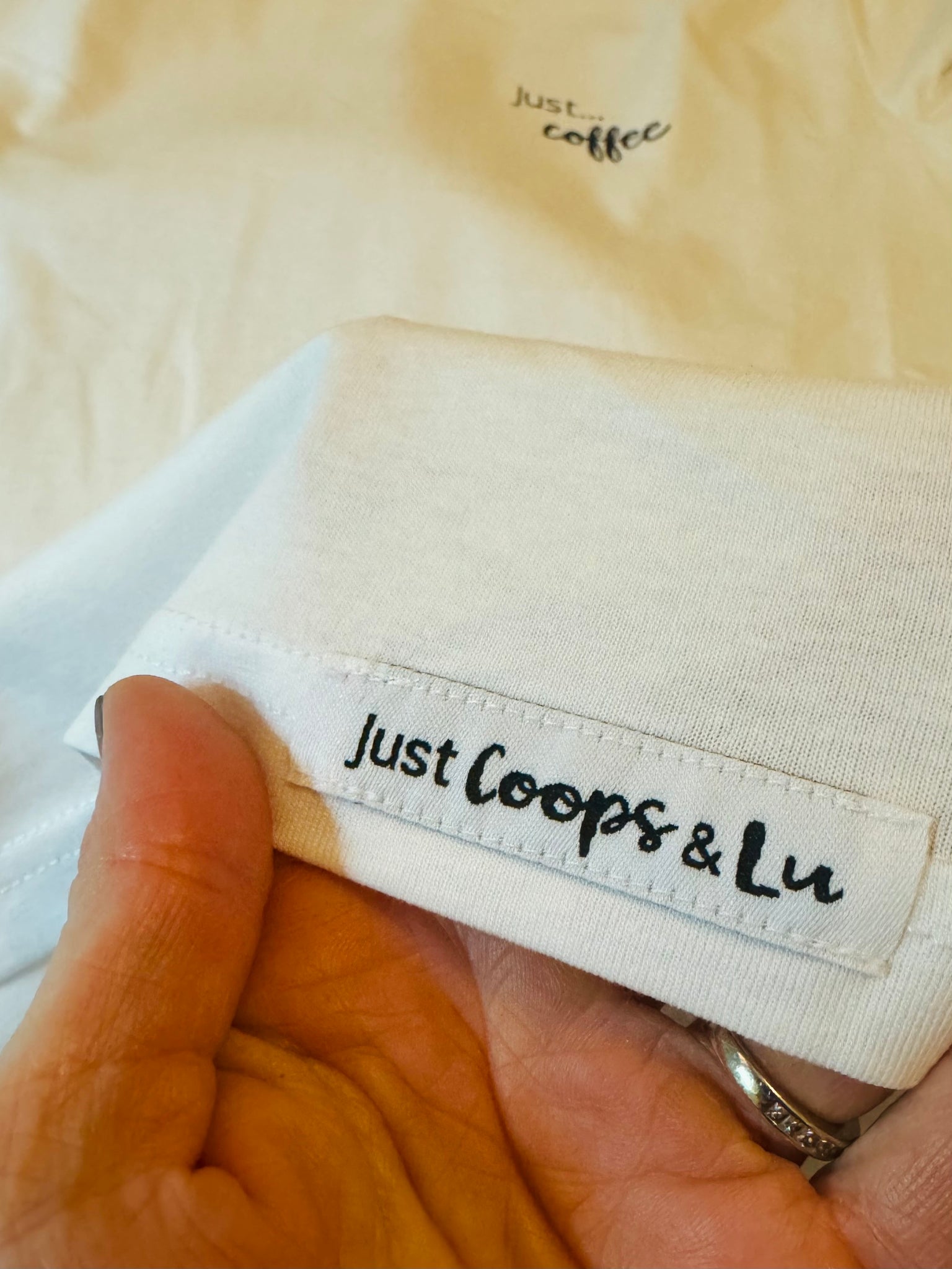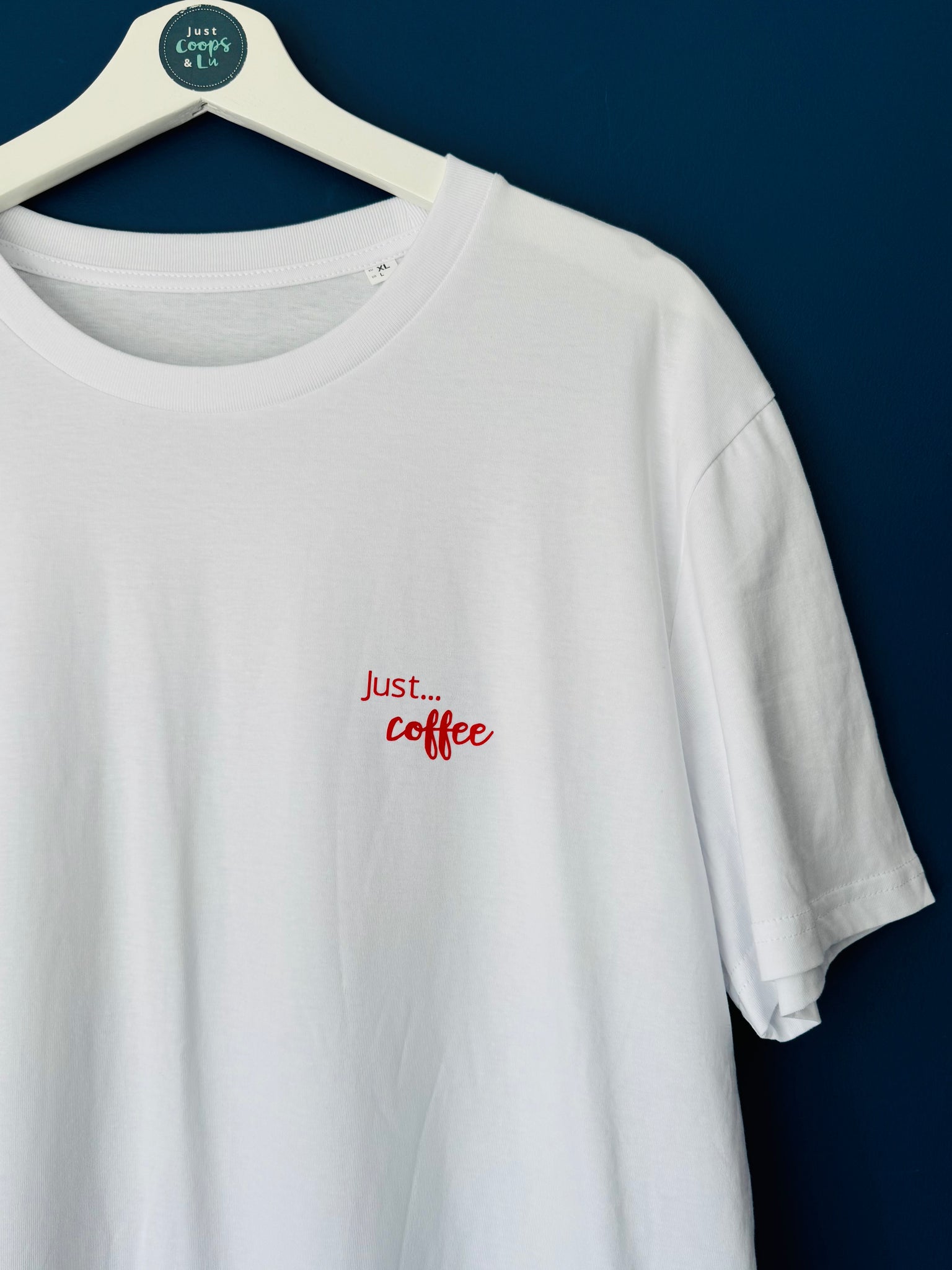 This organic white tee, size XL is hand printed with the 'Just... coffee' slogan in red.