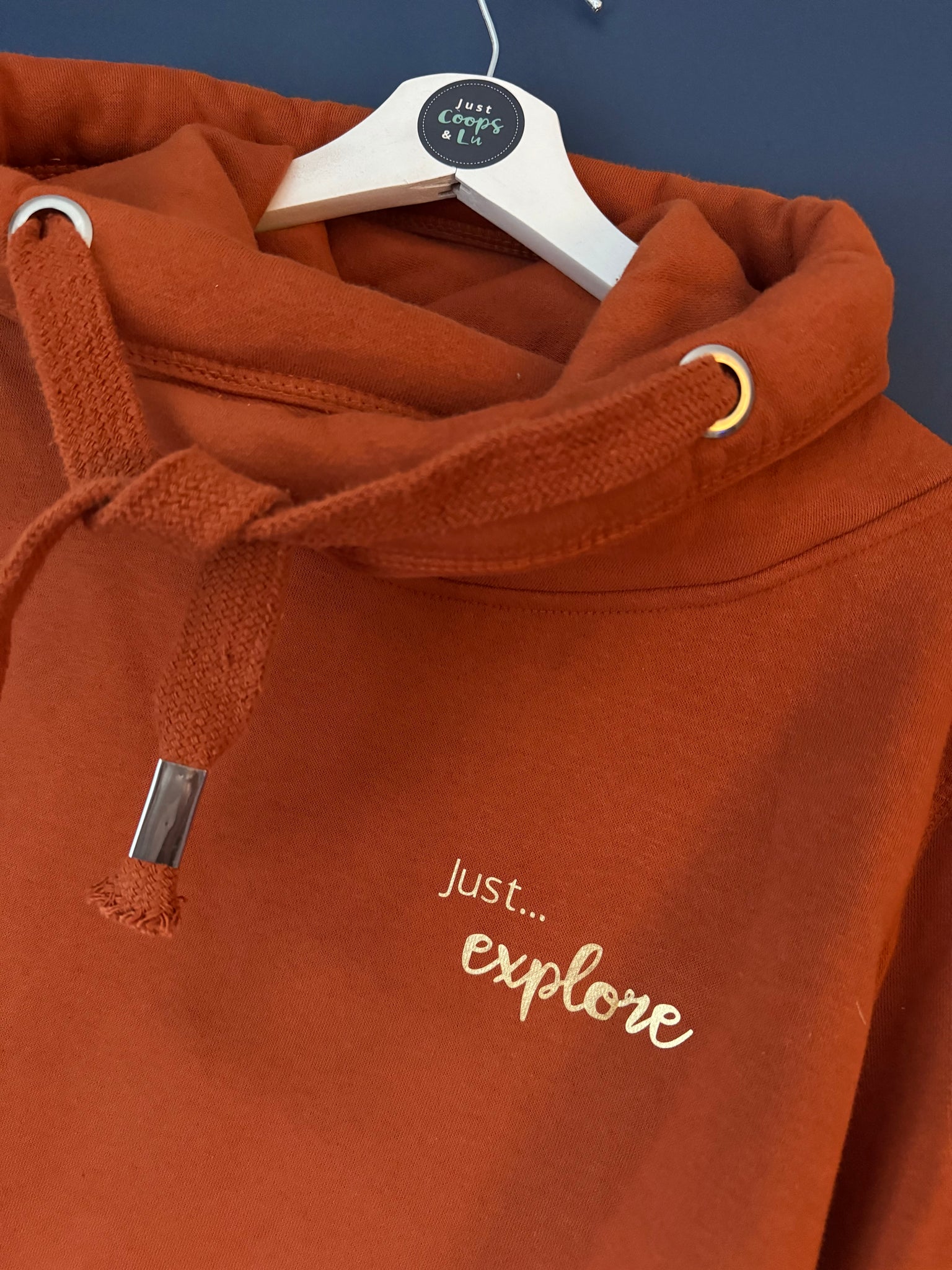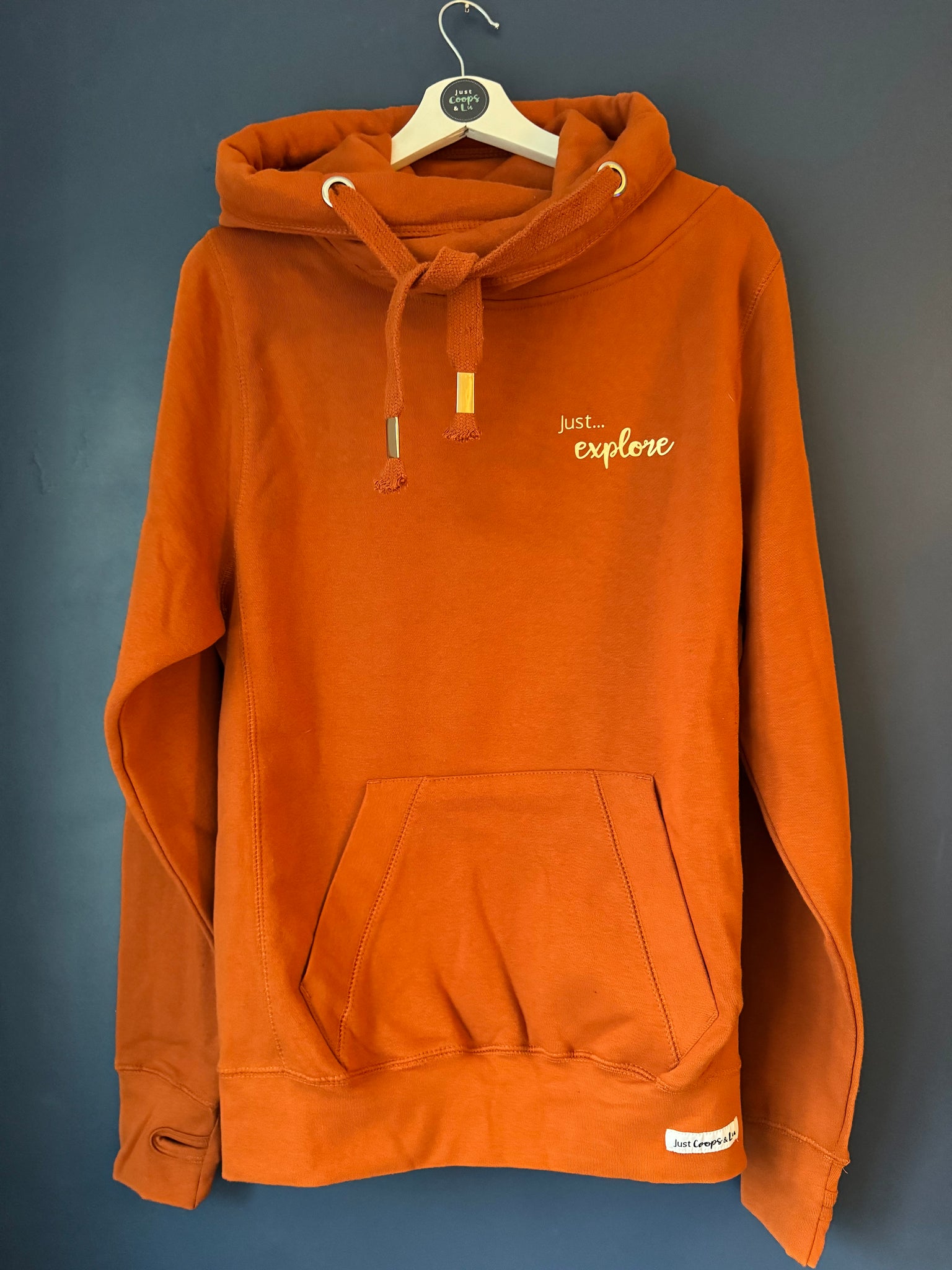GINGERBREAD Ultimate Hoodie. Size MEDIUM - 'Just... Explore' hand printed in gold.